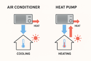 Heat Pump: A heat pump can do both cooling and heating. In cooling mode, it works just like an air conditioner, moving heat from inside to outside. In heating mode, it reverses the process, extracting heat from the outside air (even in cold weather) and bringing it inside.