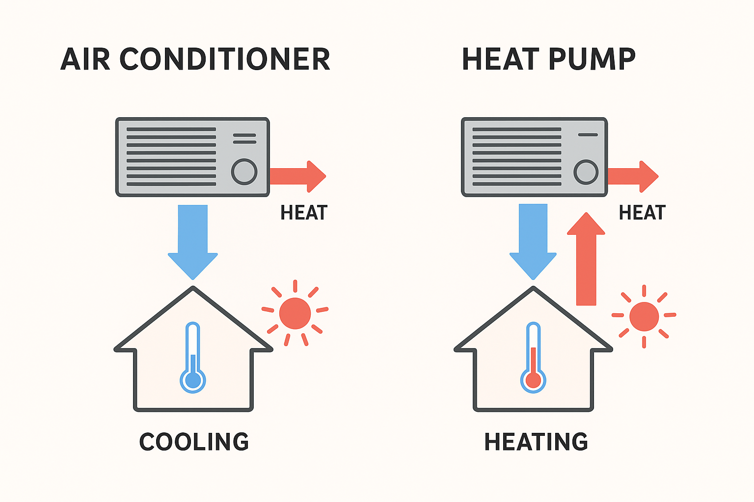 Air Conditioner: An AC system moves heat from inside your home to the outside. It cools the indoor air by extracting heat and releasing it outside. It only cools; it cannot heat a space.